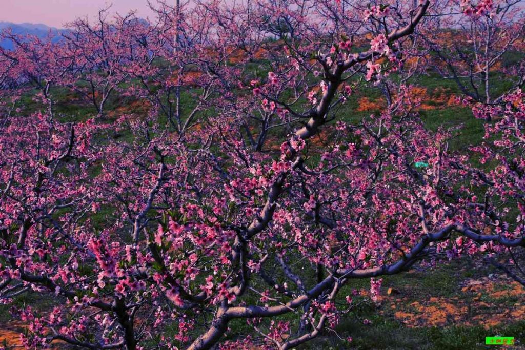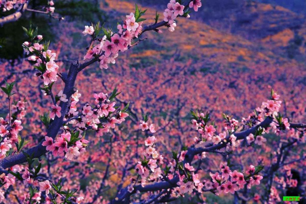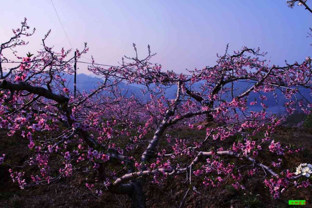 5. 辽宁省宽甸县长甸镇河口村座落于鸭绿江中,呈狭长状的一个小岛屿。每年春季,河口村满山遍野桃花盛开,姹紫嫣红,与碧绿的鸭绿江水相映妖娆,吸引着无数游人前来观赏。河口村因此赢得了“桃花岛”的美誉,声名大振。1982年,邬大为老师到河口采风,为鸭绿江河口景色所陶醉,欣然作词,铁源老师作曲,谱下了《在那桃花盛开的地方》,这首歌经蒋大为一唱走红,桃花盛开的河口,也变成了人们心目中向往的地方。在下河口村绵延5000米的沿江山坡上,分布着多达万亩几十万株燕红树和秋白桃树。五月初,漫山遍野的桃花粉红如霞,妖娆多姿,煞是美丽。满树和娇烂漫红,万枝丹彩灼春融。
