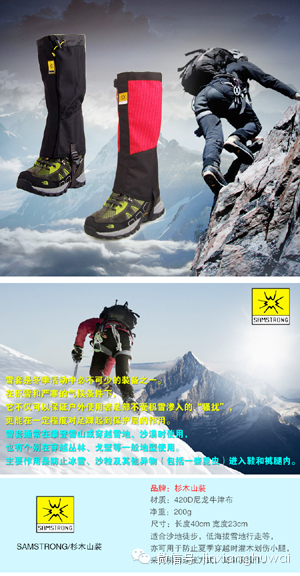 原价99元,店内特价销售35元,微信活动价格19元的超实惠雪套介绍: http://mmbiz.qpic.cn/mmbiz/tCicicbdwRNHyvo7acf7xMNmjaTrHCTrZibHRYkfXtPXhxNO1wdr5JKYdmBCP7wwvJtfMSNO4cBALJIhPuoialTqwQ/0 面料:420D尼龙牛津布 颜色:深蓝,浅蓝,红色,黑色 四色! 辅料:耐低温KAM扣件 简介:适合沙地徒步,低海拔雪地行走等,亦可用于防止夏季穿越时灌木划伤小腿,采用梯扣连接方式,简单易操作。 雪套是冬季活动中必不可少的装备之一。在积雪和严寒的气候条件下,它不仅可以保证户外使用者足部不受积雪渗入的“骚扰”,更能在一定程度对足踝起到保护层的作用。 雪套通常在攀登雪山或穿越雪地、沙漠时使用,也有个别在穿越丛林、戈壁等一般地型使用。主要作用是防止冰雪、沙粒及其他异物(包括一些昆虫)进入鞋和裤腿内。 http://mmbiz.qpic.cn/mmbiz/tCicicbdwRNHw9EEIfC4wWOwfeN2tQ7ZPWJJCice7ibRgEmbLonvy37ypyr13ibay85GvI30qiaSC4vV6UU0PwN3FA2w/0 http://mmbiz.qpic.cn/mmbiz/tCicicbdwRNHw9EEIfC4wWOwfeN2tQ7ZPWb4BkyMpPNdNFJ8vjET5xY19QSU0KhWmll0keLnq2sc01O5DDcRFTibQ/0 http://mmbiz.qpic.cn/mmbiz/tCicicbdwRNHw9EEIfC4wWOwfeN2tQ7ZPWKdBiad0Q8TNUzPSic2RqtzUJOwpbm1QJicicakFh8njvcPoF14ITgj3FJQ/0 http://mmbiz.qpic.cn/mmbiz/tCicicbdwRNHw9EEIfC4wWOwfeN2tQ7ZPWjMrNuOdlsaeqYHkq1da6HVib5mnkcWicn6zOnGZJpfjSbDRgibmOZ6ZzQ/0