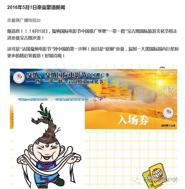2016“奈曼”嘎纳电影节,你会遇见那位明星呢? 【特别声明】: 哈尔滨行者无疆户外活动风险承担与权力放弃的协议,参加本次活动即视同同意此协议。 https://mp.weixin.qq.com/cgi-bin/appmsg?t=media/appmsg_edit&action=edit&type=10&appmsgid=505095069&token=668427746&lang=zh_CN