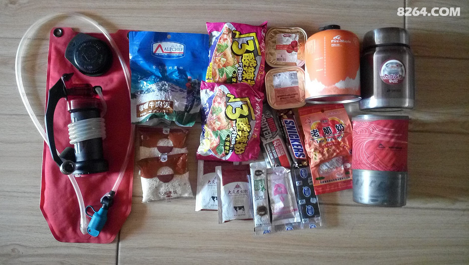 食品还是沿袭轻量化的老路子,正餐是山之厨、酸辣粉、免蒸米饭、三全菜肴,外加花生米、葡萄干、士力架组合的路粮,水源情况不明,准备了水袋和过滤器。
